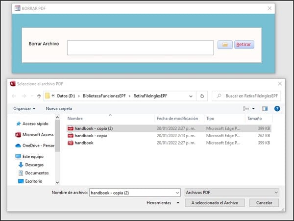 Hago clic en la carpeta abrir y obtengo la lista de los archivos PDF, si hago doble clic se selecciona el archivo y se cierra el formulario .