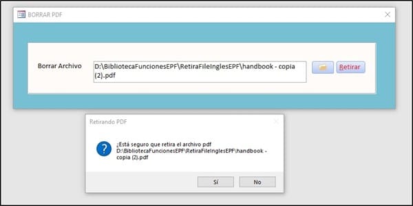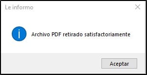 MsgBox "Archivo PDF retirado satisfactoriamente", vbInformation, "Le informo"