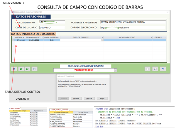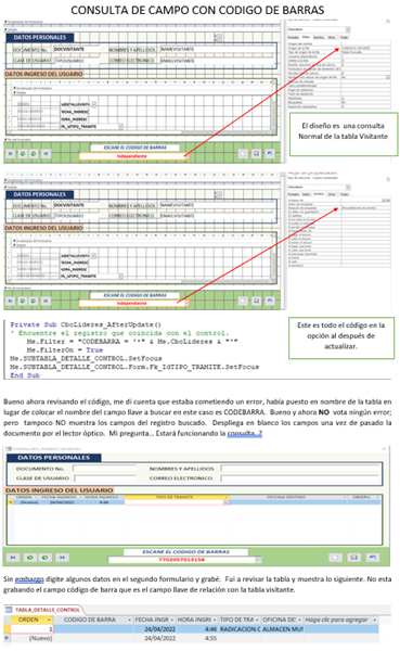 Formulario con dos tablas. La primera Tabla Visitantes que es el encabezado y la segunda Tabla control visitantes, (Subformulario) que registra las entradas a las diferentes oficinas. Al llegar el usuario se le pide el documento de identidad y se escanea con el lector óptico. PERO...