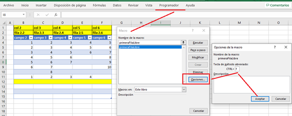 Seleccionarla y desde el botón Opciones, colocar una letra (en mi ejemplo utilicé f). Se recomienda NO utilizar letras que estén asociadas a otros procesos de Excel o Windows (A, C, V, etc)