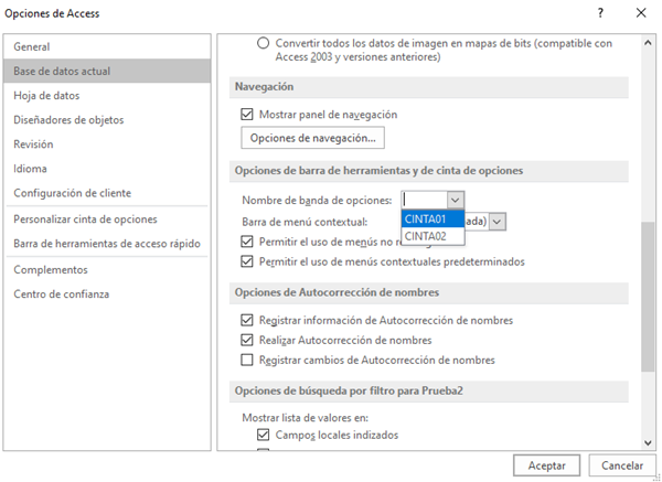 Tengo una base de datos de MS Access 2016 y quiero, a través de código VBA, que dependiendo de cual usuario se haya logueado, se lance una cinta de opciones, de las que tengo cargadas en la tabla UsysRibbons. He buscado y solo encuentro ejemplos de como usar una cinta para un formulario o para un informe; pero necesito que esté disponible para toda la base de datos. ¿Existe forma de hacerlo desde VBA o la única forma es hacerlo manualmene desde la configuración de inicio de la BD?