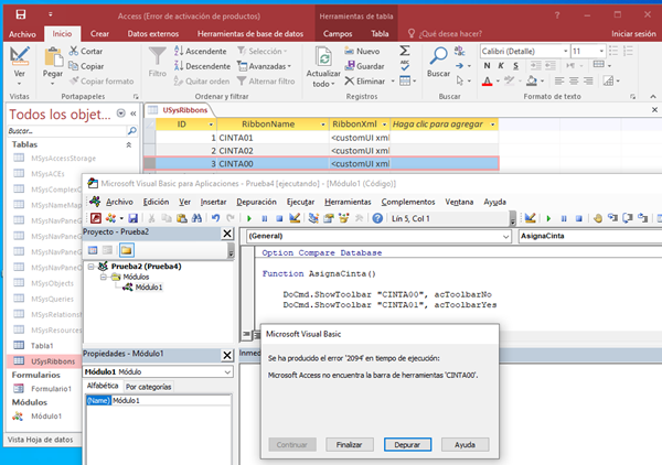 ¿Cómo puedo lanzar una cinta de la tabla UsysRibbons usando VBA en Access 2016?