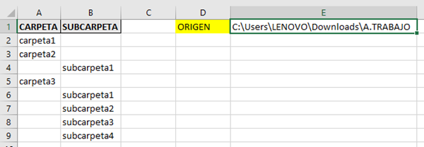 'la ruta de la carpeta principal se obtiene de la celda E1 (SIN BARRAS)