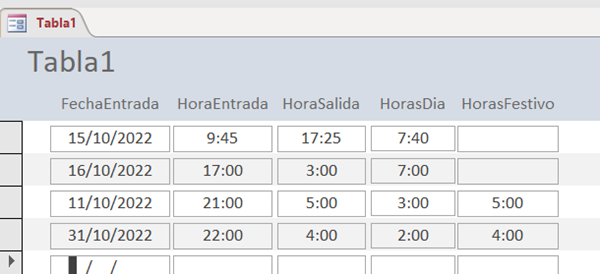 2º Caso.- Entra un día pero sale en la madrugada del siguiente que no es festivo.- En Horas día te pone las que ha trabajado ese día, ( no sé si quieres que te contabilice las que ha trabajado el día siguiente, por eso no muestra nada)