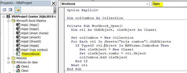 Pon la siguiente macro en un módulo o en el evento Open de ThisWorkbook, para que cuando abras el archivo, la macro se ejecute y los combos sean cargados en la clase: