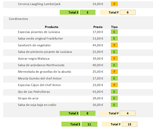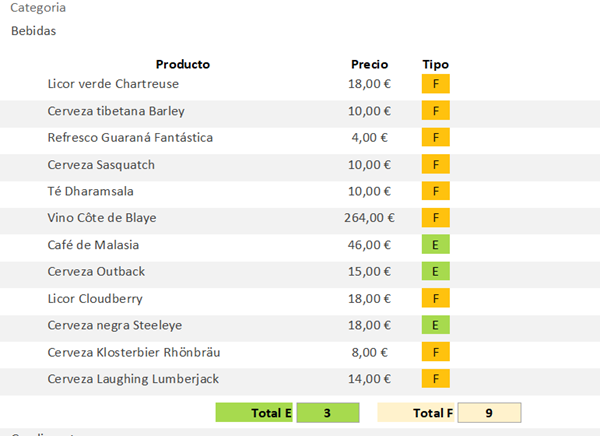 Como se puede ver debajo de la columna TIPO se muestra si la actividad es E o F (extra/función). Necesito calcular cuantos registros son E y cuantos F.