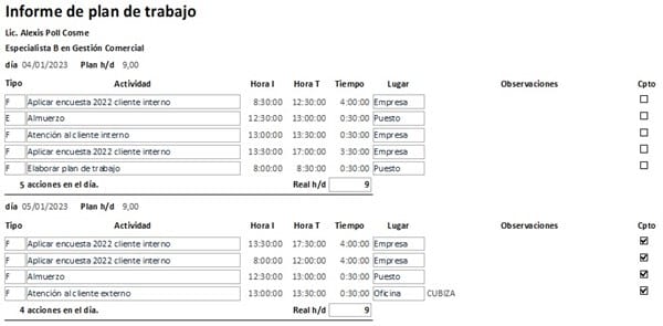 Tengo una base de datos para el control del plan de trabajo. De ella obtengo un informe como el que muestro a continuación