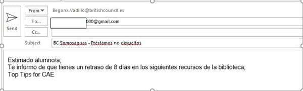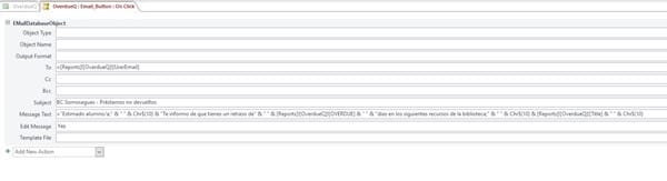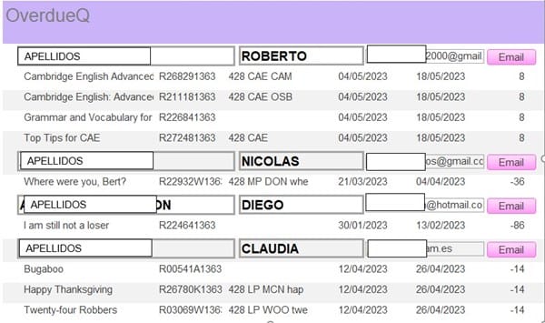 Tengo el siguiente Informe al que he añadido un botón para enviar un email a cada usuario con los libros que tiene retrasados.