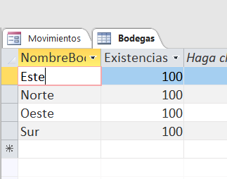 Otro ejemplo. Si tengo una tabla Bodegas con unas existencias(para comodidad le pongo a todas lo mismo)