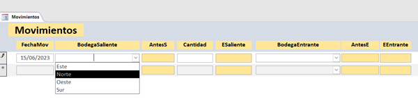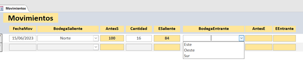 Me pone las nuevas existencias de la bodega saliente, me actualiza la tabla Bodegas. En el combinado Bodega Entrante sólo me muestra las bodegas distintas de la saliente. Y en el momento que selecciono una