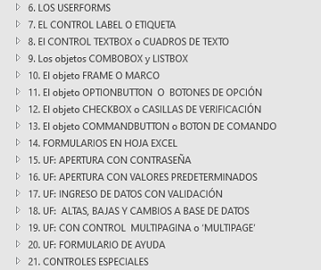 Les recomiendo el manual de Userforms: un capítulo para el desarrollo de cada control. Con libros de ejemplos listos para usar!