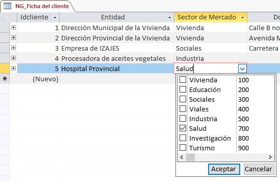 Tengo una BD en Access donde mis clientes (Entidad) están identificados por el Sector de Mercado a que pertenecen. Esto lo hago a través de un combo como se ve a continuación.