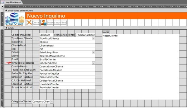 Por orden cronológico he dado de alta un cliente (con categoría propietario) y posteriormente un inmueble. Por último en un formulario distinto doy de alta un nuevo cliente (con categoría inquilino) por lo que tiene que relacionarse con un inmueble ya existente mediante el control "inmueblerelacionado".