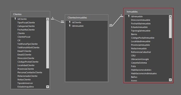 Tengo por tanto una tabla "Clientes" y una tabla "Inmuebles", cada una con un campo principal IdCliente e IdInmueble.