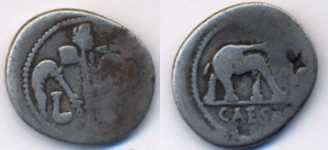 Haciendo unas excavaciones por mi huerto, nos hemos topado con una moneda, al parecer de plata que por una cara lleva un elefante y debajo pone caesar y en la otra cara lleva como un acha y unos cuantos dibujos más que no se que son.
