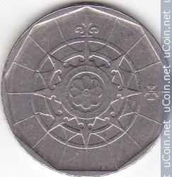 Moneda, portugesa 1986. Valor 20 escudosmoneda octogonal con un escudo parte superior arriba, el escudo esta formado por 7 torres y 5 escudos. "e.Vaz inom" es el escrito que ay casi imperceptible debajo de la moneda a ambos lados de donde esta la palabra escudo. La otra caraen su totalidad lleva un grabado cen forma de carta náutica o estrella polar o incluso diría que tiene que ver con una brújula, algunios detalles son; hay 7 flechas y en dos de ellas una termina con una cruz templaria, y en la punta de otra flecha termina lo que podría ser una punta de lanzaantiguaen el centro de este grabado hay una especie de "trébol e cuatro hojas" o eso creo.