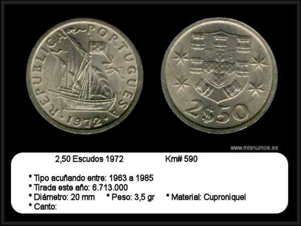 Otra moneda 1972 creo que el valor seria 2$50, es una muy pequeña con un barco en el centrolleva cuatro velas y una bandera en un mástil enorme, es cuadrada alargándose hacia popa y lleva 5 estrllas dentro de la misma. En la otra cara, un escudo con 7 torres y 5 escudos que esta rodeado parcialmente por unas estrellas polares ( 4). Y debajo del escudo pone 2$50.