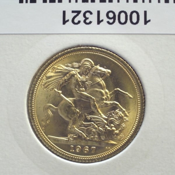 * Moneda inglesa de 1967 con la inscripción "Dei gratia regina F.D. Elizabeth II"