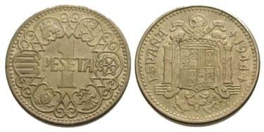 Anverso: 1 PESETA rodeado de castillo, león, cadenas, yugo y flechas y granada.