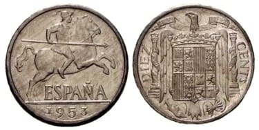 Reverso: DIEZ CENTS con el escudo de España en tiempos de la dictadura, sobre el águila de San Juan y yugo y flechas debajo.