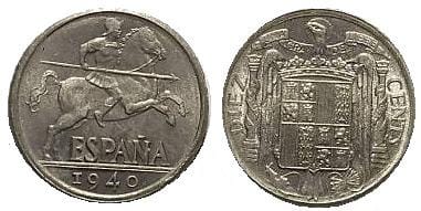 Anverso: ESPAÑA 1940 debajo de un jinete con lanza a derechas (imitando el modelo de las monedas íberas de un as).