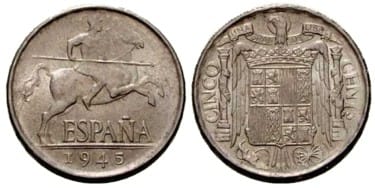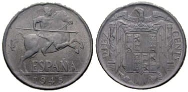 Anverso: ESPAÑA 1945 debajo de un jinete con lanza a derechas (imitando el modelo de las monedas íberas de un as).
