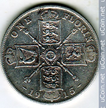 1 Florin 1915 Valor, escudo coronado en cruz / Perfil Jorge V