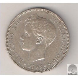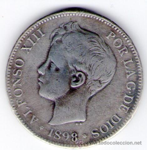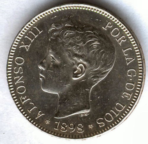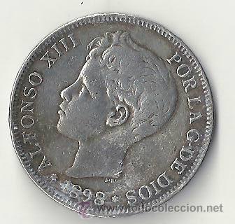 Anverso: ALFONSO XIII POR LA G DE DIOS * 1898 * alrededor de un busto del rey niño a izquierdas.