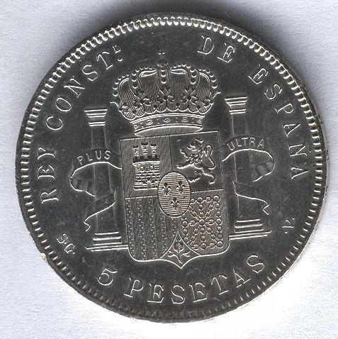 Reverso: REY CONSTL DE ESPAÑA SG 5 PESETAS V alrededor de un escudo coronado de España.