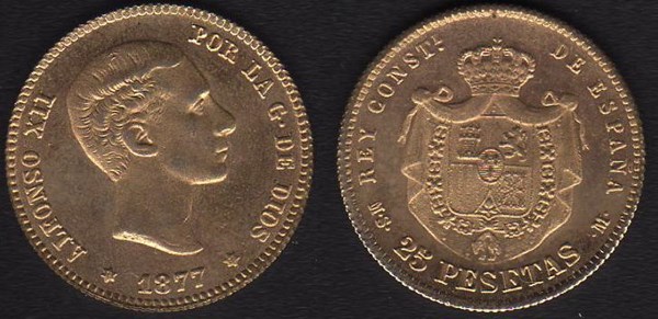Anverso: ALFONSO XII POR LA GRACIA DE DIOS * 1877 * alrededor de un busto del rey a derechas
