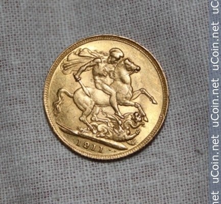 En el reverso se ve una imagen de San Jorge matando al dragón, el año 1911, y una pequeña C mayúscula en los pies del dragón.