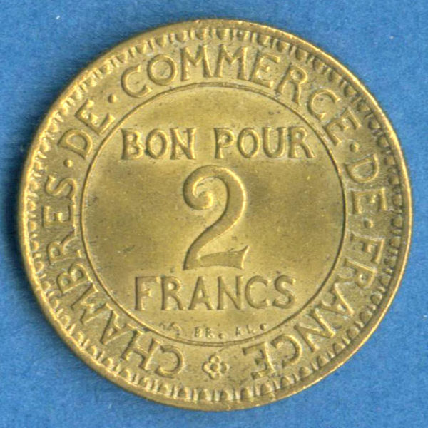 Reverso: Leyenda CHAMBRES·DE·COMMERCE·DE·FRANCE flor. Orla circular, dentro BON POUR 2 FRANCS, debajo BR·AL. Listel liso, gráfila de puntos y líneas.