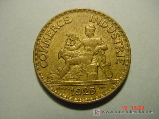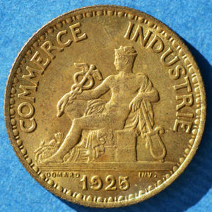 Anverso: Mercurio sentado a izquierda. Alrededor la leyenda COMMERCE INDUSTRIE, debajo 1925, entre DOMARD y INV. Listel liso, gràfila de puntos y líneas.