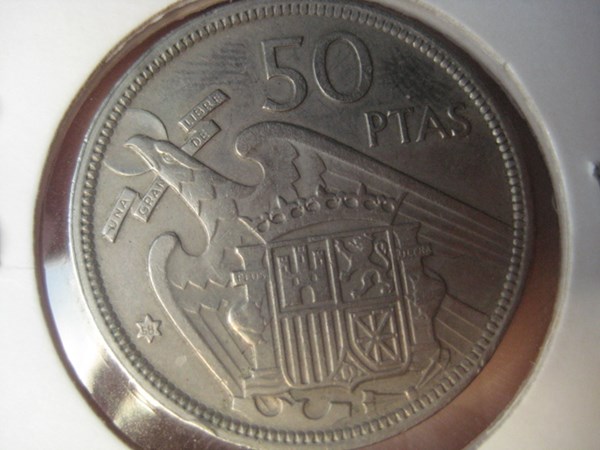 Reverso: 50 PTAS con el escudo de España simplificado en tiempos de la dictadura, sobre el águila de San Juan, con el yugo y las flechas debajo, * con el año de acuñación a la izquierda del águila.