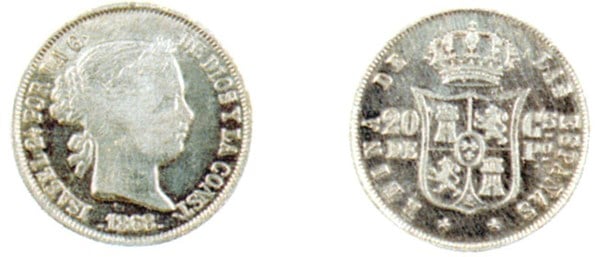 Esta moneda es de 20 centavos de peso, mide 22 milímetros y tiene 5,19 gramos, de Manila, se pueden ver las estrellas de cinco puntas y del año 1965 (aunque la imagen es de muestra y sale de 1868).
