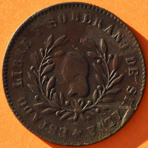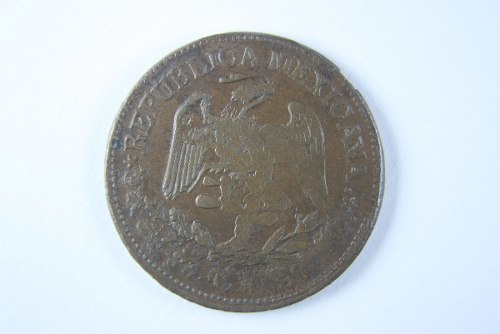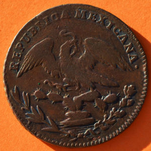 1/4 real 1830 Jalisco 544, los valores están arriba a la derecha, la imagen de la moneda abajo a la izquierda.