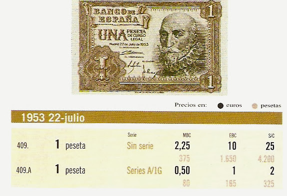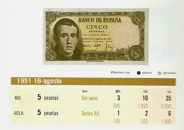 De 5 Ptas de 16 de agosto de 1951, con Jaime Balmes en el anverso, se fabricaron 379.000.000. Sin serie, con todo el abecedario y desde "1A" hasta "1L". Tamaño 101 por 50 mm. Circularon desde el 7 de diciembre de 1951.