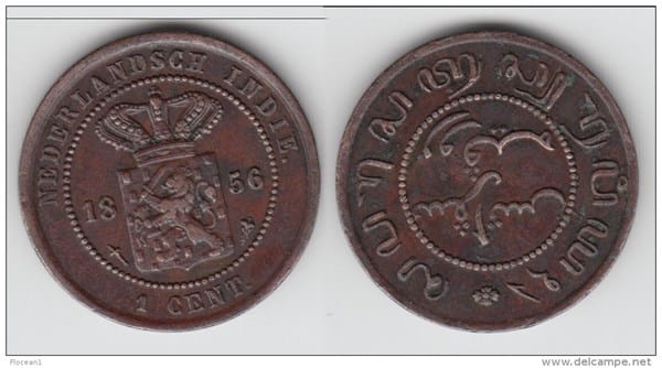 Hoy te pido información de una moneda holandesa del año 1856. En una cara hay un escudo con corona y dentro un león coronado con una espada, NEDERLANDSGH INDIE: y el año 18 al lado izquierdo del escudo y 56 al lado derecho. En la otra cara pone unas letras que me parecen árabes.