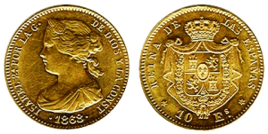 Tengo una moneda de Isabel 2ªde oro, (10 escudos), de fecha 1869, el problema es que ya estaba la República, he mirado por internet y figura que se emitieron y circularon, he preguntado y me dicen que no, que es una copia (pero me la quieren comprar). No he encontrado nada que indique una R o una C, solo en las estrelas que figura 18 y 69. ¿Me podrías decir algo de la misma?
