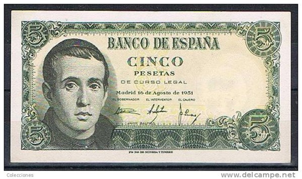 Billete de 5 pts de16 de agosto de 1.951 de jaime balmes. Perfecto estado