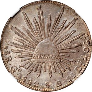 México. Guanajuato.(Fábrica que la acuñó), valor 8 Reales, 1882-GoSB