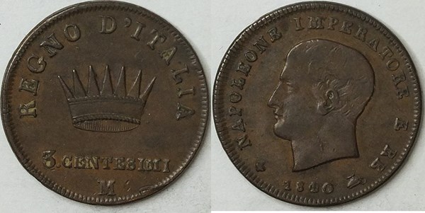 3 cvs. 1810 M Valor y corona / Perfil Napoleón y fecha