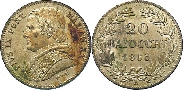20 baiocchi 1865 “, corona de hojas y fecha / Perfil Papa Pío IX