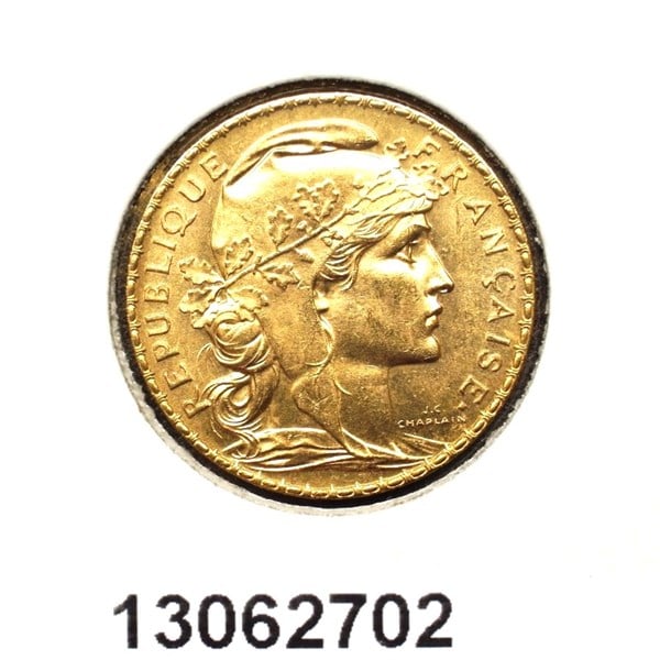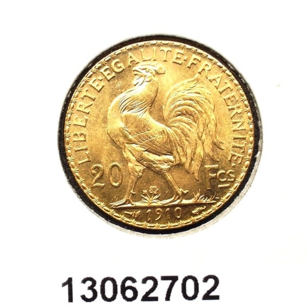 * 20 francos franceses de 1910 con la inscripción "Liberté, egalité,