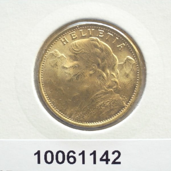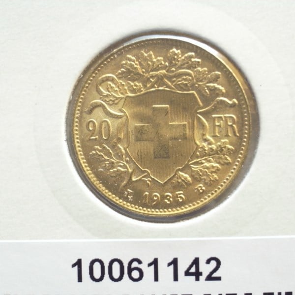 * 20 francos suizos de 1935 con la inscripción "Helvetia"