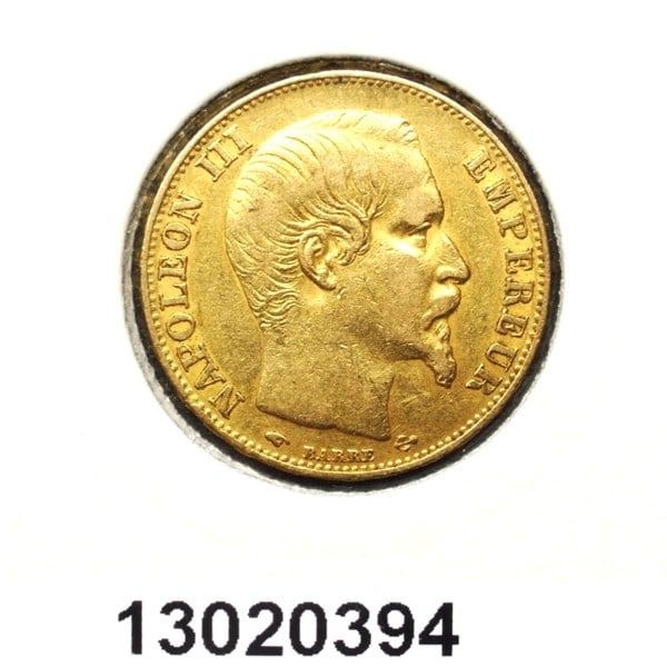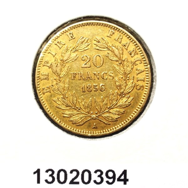 * 20 francos franceses de 1856 con el rostro de Napoleón III