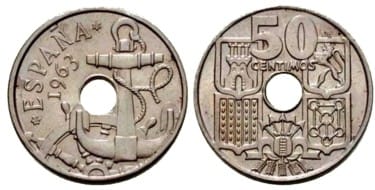 Anverso: * ESPAÑA 1963 * a la izquierda de un ancla y un timón, con taladro central.