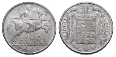 Anverso: ESPAÑA 1941 debajo de un jinete con lanza a derechas (imitando el modelo de las monedas íberas de un as).