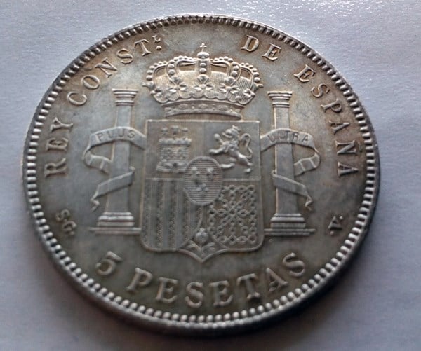 Reverso: REY CONSTL DE ESPAÑA MP 5 PESETAS M alrededor de un escudo coronado de España.