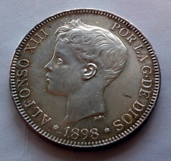 Anverso: ALFONSO XIII POR LA G DE DIOS * 1898 * alrededor de un busto del rey niño a izquierdas.